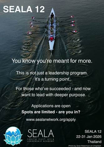 Leadership. Transformation. South East Asia. We’re thrilled to announce that SEALA 12 will take place in Thailand in January 2026! As our network expands across the region, the next SEALA Academy promises another unforgettable journey of growth, connection, and conscious leadership. Know a rising leader in South East Asia? Encourage them to apply and be part of this powerful experience. Apply now or share the link: http://www.sealanetwork.org/apply